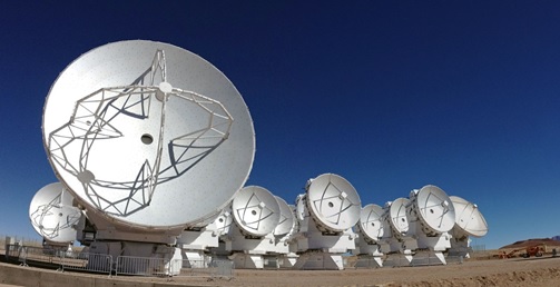 The Atacama Large Millimeter Array (ALMA) is one of the world’s largest radio telescopes with 66 movable antennas. It is installed 5000 m above sea level in the Atacama Desert of Chile and observes at millimeter and submillimeter wavelengths to study star formation and the early universe.