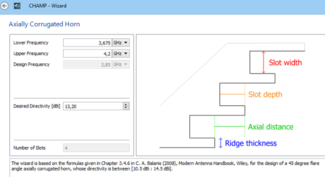 A new wizard, for axially corrugated horns. The need for this became evident when we first introduced dual reflector design in CHAMP and is now available. Based on two input parameters only, frequency band and directivity, a 45-degree flare angle horn is synthesized. It is parameterized such that the user can easily specify variables to enable further refinement of the horn geometry by means of optimization.