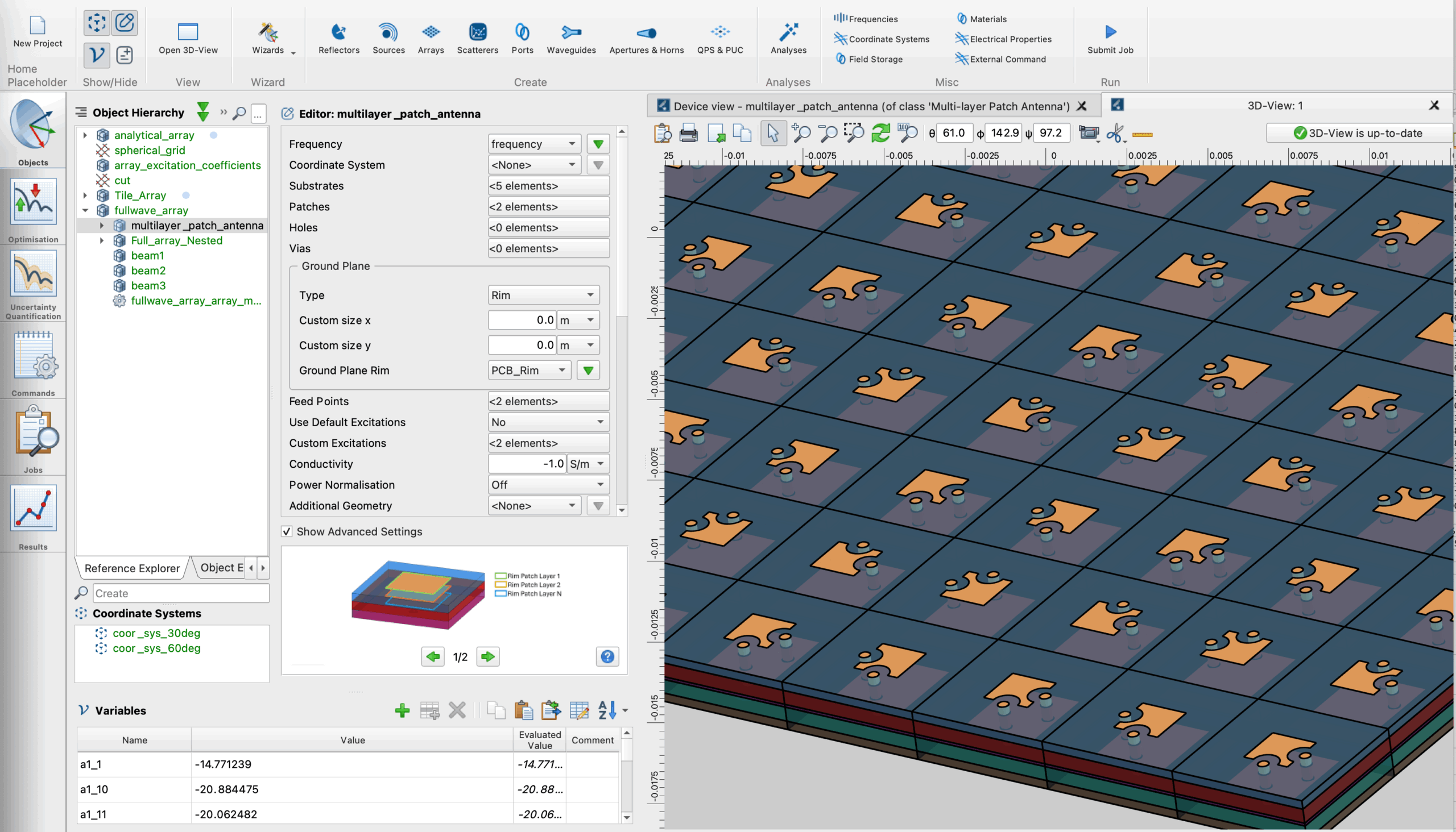 A planar full-wave patch array set up and visualised in TICRA Tools using the ARRAY Editor and MoM-based full-wave solver.