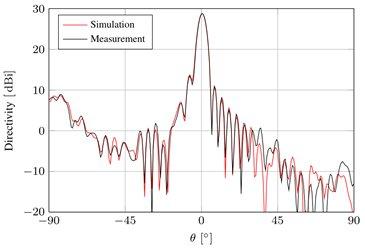 An example is shown below where a contoured beam reflectarray has been synthesized using the code developed during the study. The reflectarray is optimised to radiate a high-gain beam within the European coverage with sidelobe suppression on the Southern African contour. The reflectarray was measured at the DTU-ESA Spherical Near-Field Antenna Test Facility and the agreement between simulations and measurements is very good.