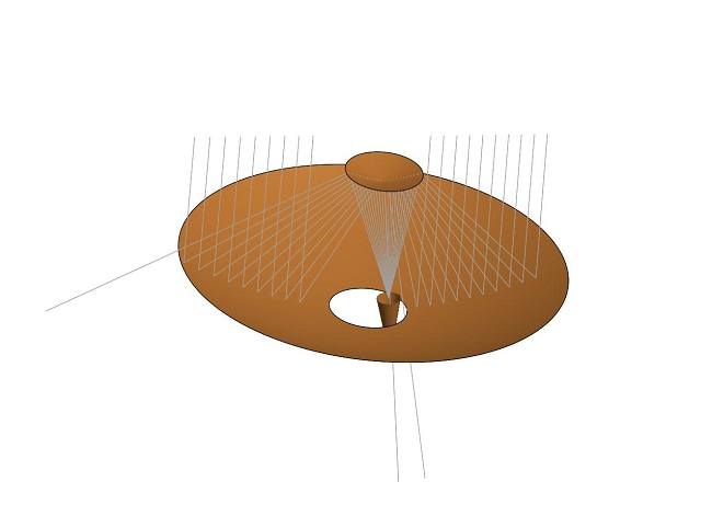If a larger feed element is needed (to reduce spill-over, for example), it is easy to move the feeds accordingly by just changing one parameter, feed_spacing. If a different paraboloid is introduced it is also easy to change Petzval’s surface, as it incorporates the paraboloid’s focal length by means of a variable, focal.