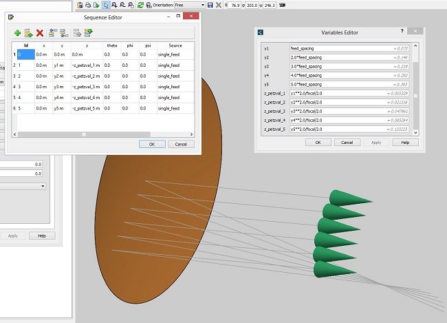 Variables and expressions are illustrated by the design above, where a feed array is illuminating a standard offset reflector antenna. The feeds are located on the so-called Petzval’s surface, a concept known from optics and sometimes used in antenna designs when studying scanning performance.