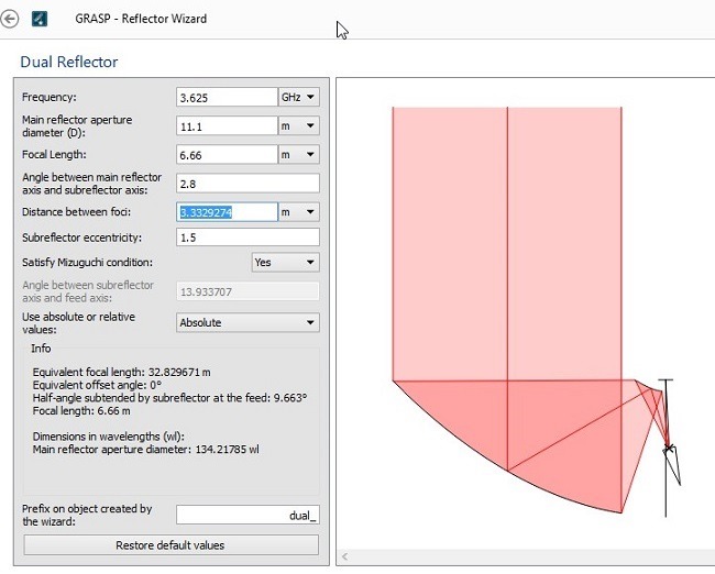 In earlier versions the size of the reflector aperture diameter was given by the user when designing a system in the Wizard. All other geometrical parameters (e.g. focal length, inter-focal distance of sub-reflector, and others) could be specified relative to the diameter, as this is a common way to specify antenna systems. Many users have missed the alternative to specify these numbers as absolute rather than relative values, since they often are given for example the focal length in this way. Their need is now served.
