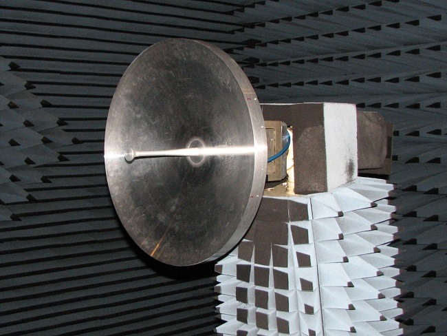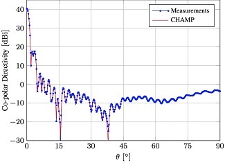 The antenna is around 44λ at 20 GHz and consists of a hat-feed and a shaped reflector, all designed with CHAMP. Testing was done at the Technical University of Denmark, the location of the high-precision ESA-TUD spherical test range. The hat, or splash-plate as the reflector in front of the feed aperture is sometimes called, is supported by a dielectric material. The influence of this is of course taken into account in the design as well as the analysis process.