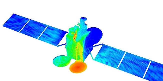 Currents resulting from a full MLFMM analysis of a telecommunications antenna, including scattering in the full-size satellite. The source is the dual-reflector Ku-band antenna on the West wall of the spacecraft. Credits to M. Sabbadini of ESA for providing the geometry of the spacecraft.