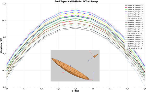 As an example, the feed taper and design offset in a single reflector system can be swept to obtain a knowledge about the antenna performance with the variation of the design parameters. The user selects the start- and end-value as well as the number of samples of each sweep parameter, and the specified TICRA Tools analysis is performed for each combination of the parameters. Following the analysis, the many results are easily plotted or further processed.