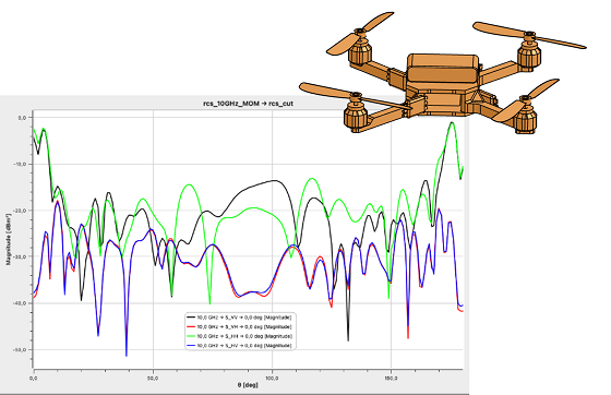 The RCS is mainly used in radar systems and is a measure of how detectable a scatterer is by the radar system. As an example, the monostatic RCS of a drone, calculated using the new feature, is illustrated below: