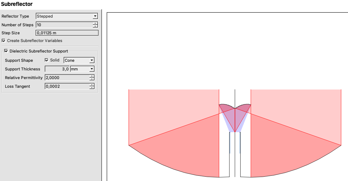 The new subreflector page allows easy setup of a stepped profile.