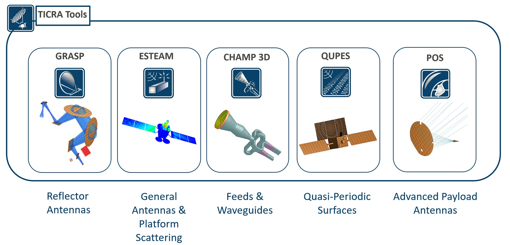 Each software product within TICRA Tools – GRASP, ESTEAM, CHAMP 3D, POS, and QUPES – can be used independently or in combination. This modular structure supports tailored workflows while still ensuring full interoperability when designing advanced antenna systems.